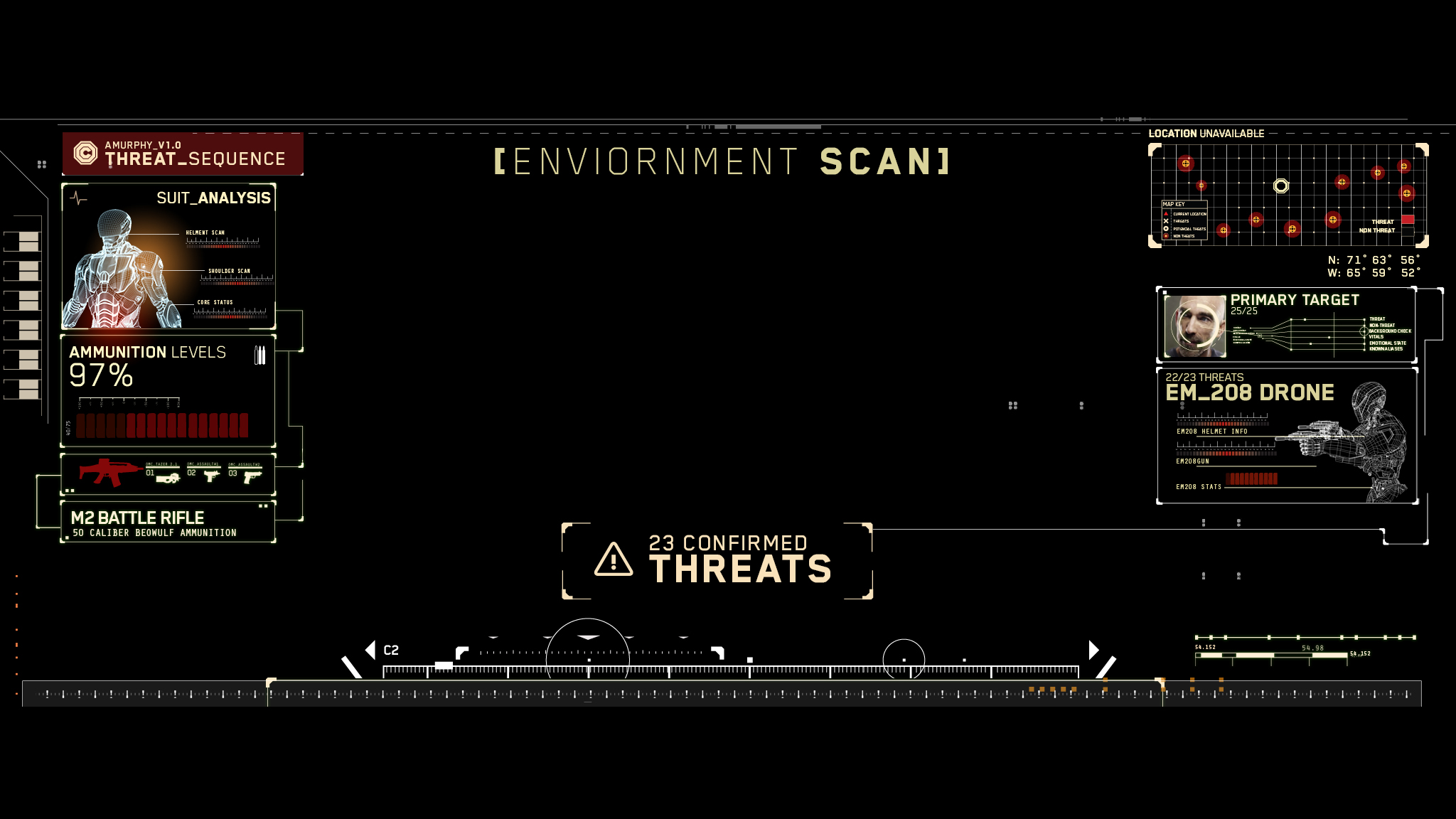 While working at Perception I helped lead the design and animation of point-of-view HUDs, large-screen interfaces, and a talk show broadcast package for the reboot of Robocop. Because of the strong narrative component to the HUD, I developed the look and functionality of the design both at Perceptions NYC studio as well as on-site with director Jose Padilha and editor Daniel Rezende.